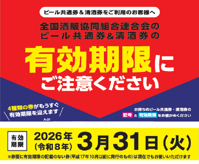 ビール共通券取り扱い告知用ポスター(有効期限注意喚起付き)